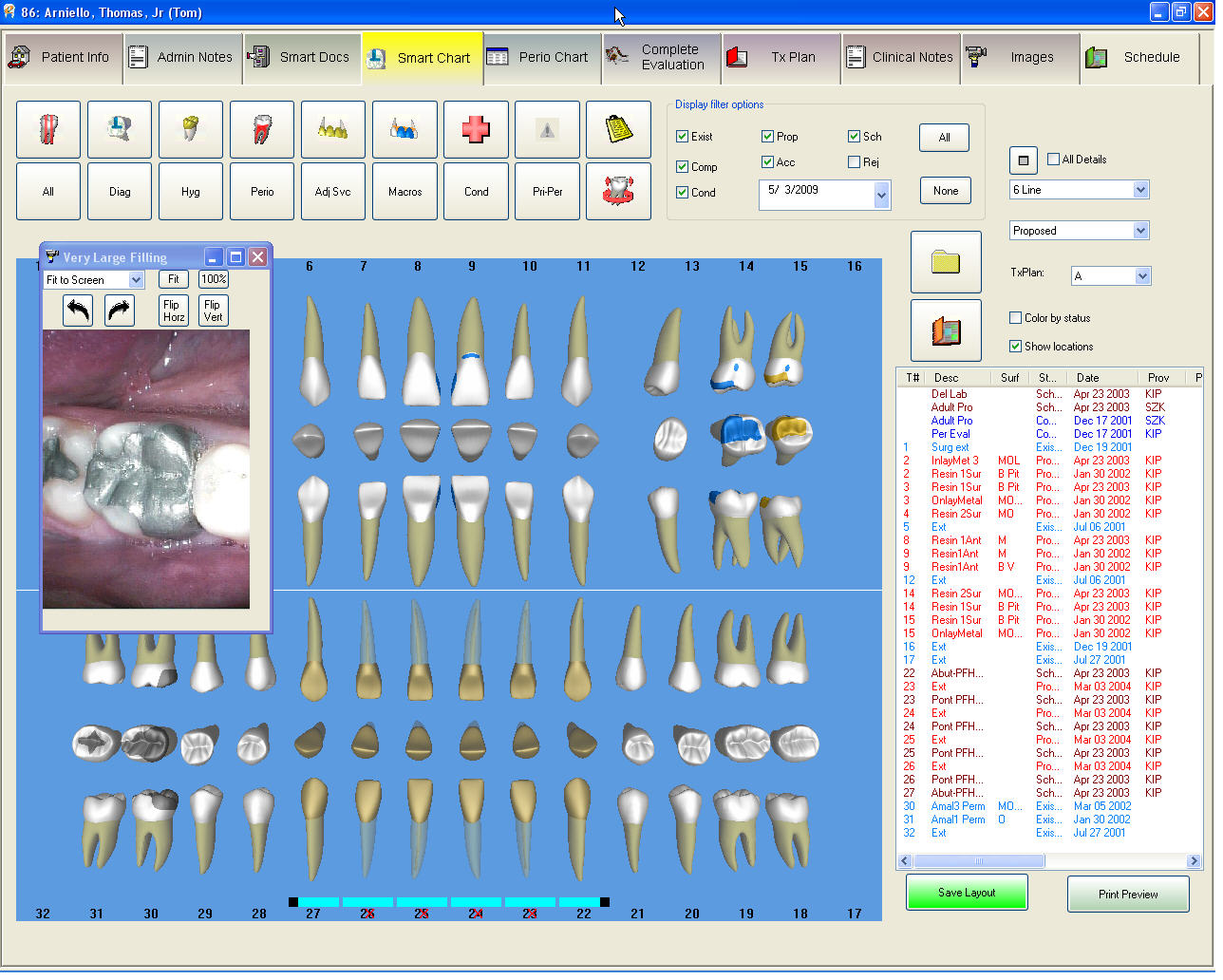 Also notice in the large screen shot above that we were easily able to draw the restorations on numbers 30 and 31 to match the actual restorations in the patient's mouth as shown in the intraoral image floated above the two teeth in the chart. The picture was taken and stored in our images tab for that patient and simply floated over the SmartChart tab for easy reference.